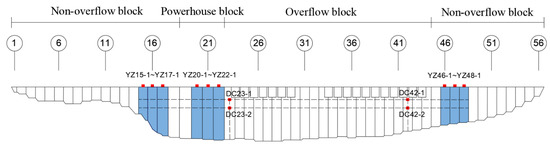 The proposed method is verified using the monitoring data of a real concrete gravity dam, which has a maximum height of 107.5 m, a dam crest elevation of 230.5 m, and a total length of 1039.1 m. The upstream and downstream views of the dam are shown in Figure 4. As shown in Figure 5, the dam is divided into 56 dam sections. Sections 1 to 18 form the right bank non-overflow dam section, sections 45 to 56 form the left bank non-overflow dam section, sections 19 to 22 form the powerhouse dam section, and sections 23 to 44 form the overflow dam sections. In this study, nine measurement points are selected at the same elevation, and four measurement points are selected at different elevations, respectively. Among them, measurement points YZ15-1, YZ16-1, and YZ17-1 are selected on the right bank, measurement points YZ46-1, YZ47-1, and YZ48-1 are selected on the left bank, measurement points YZ20-1, YZ21-1, and YZ22-1 are selected on the intermediate power station dam section, and measurement points DC23-1, DC23-2, DC42-1, and DC42-2 are selected at different elevations on the overflow dam section. The dataset selected for this paper consists of 1461 sets of displacement, water level, and temperature measured from 1 January 2019 to 31 December 2022. The displacement curves of the selected dam blocks and the corresponding curves of upstream water level and air temperature are shown in Figure 6. After normalizing the monitoring data, the specific hysteresis time of temperature affecting the dam displacement can be derived by using the sliding match method and the cosine similarity calculation method, and the results are shown in Figure 7 [41].