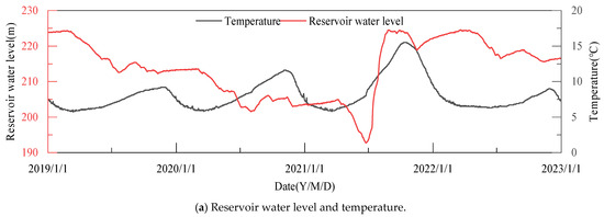 Dam deformation can be influenced by various environmental factors, including hydraulic pressure and temperature. Hydraulic-Seasonal-Time (HST) and Hydraulic-Temperature-Time (HTT) models are fundamental statistical models for selecting input variables to predict dam displacement [33,34]. Building on the HTT model, Kang et al. [35,36] proposed a long-term air temperature-based Hydraulic-Air temperature-Time (HTAT) model to achieve more accurate predictions of dam behavior. However, the hysteresis effect between dam deformation and changes in environmental factors is often observed [37,38,39]. Therefore, the hysteresis effect of dam deformation on temperature must be taken into account in the analysis process. Wang et al. [40] proposed the Hydraulic-Hysteresis-Seasonal-Time (HHST) model, which considered the hysteresis effect of environmental factors. Ren et al. [41] introduced a hysteresis quantification algorithm to estimate the hysteresis days of environmental factors affecting deformation.