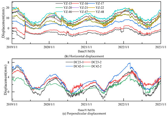 As a major component of water storage systems, dams play a significant role in water supply, flood control, power generation, and irrigation. However, the potential risk of dam failure increases due to a variety of reasons, including hydrology, geology, construction quality, material aging, and operational management. Additionally, in recent years, changes in extreme climate have adversely affected the dynamic behavior of dam structures and their interactions, thereby increasing the potential risk of dam failure [1]. In the event of a dam failure, the downstream area will be severely impacted. Therefore, the work of dam safety monitoring is particularly prominent and important [2,3]. Displacement is a critical indicator of dam safety monitoring, as it can effectively reflect the degree of operational safety and structural integrity of dams [4,5]. Analyzing measured data from dams and establishing displacement prediction models based on these data has become one of the primary focuses of dam health monitoring.