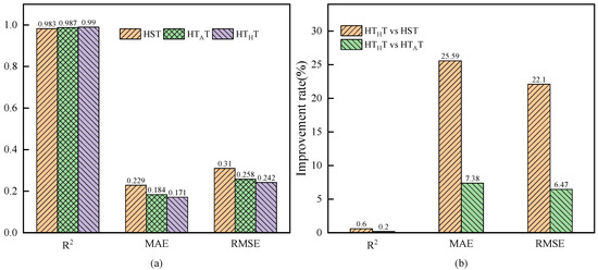 Prediction performance histogram: (a) performance metrics; (b) comparison of performance improvement.