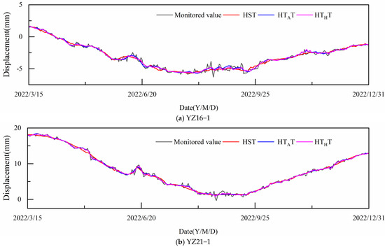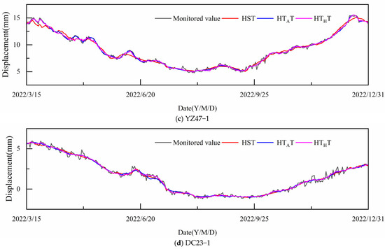 This paper mainly follows the method from reference [41], using cosine similarity to initially quantify the lag duration. Subsequently, to facilitate the establishment of a factor set for the MIMO model, the lag time is approximately set to 120 days. The traditional HST factor set and the recently proposed HTAT factor set (a lag of 180 days is chosen for comparison in this study) are selected for comparison with the proposed HTHT factor set in this paper, and the constructed factor sets are shown in Table 2. A total of 13 measurement points are selected to predict displacement under the single-output PSO-LSSVM model with different factor sets. The average value of the prediction performance of all the measurement points is taken as the evaluation index to compare the prediction accuracy under different factor sets. The results of the analyses are shown in Figure 9. In each area, a single representative measurement point is selected to plot the displacement prediction fitting curve. The prediction results are displayed in Figure 10. The analysis indicates that the proposed HTHT factor set demonstrates the highest prediction accuracy. Compared with the HST factor set, the average enhancement rate in the HTHT factor set of R2, MAE, and RMSE has reached 0.60%, 25.59%, and 22.10%, respectively. In subsequent studies, the HTHT factor set, which considers the hysteresis effect of temperature on displacement, will be employed in the analysis.