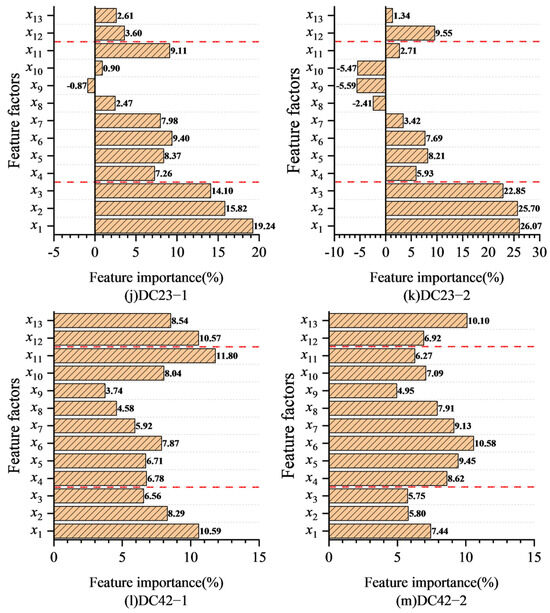 The feature importance ranking of different measurement points is calculated by the ReliefF feature selection method, and it is evident that there is a consistent trend in the feature importance ranking of measurement points in the same area. The results are shown in Figure 11. It can be assumed that the temperature factor exerts a greater influence on dam displacement in the non-overflow dam section, while the hydraulic pressure factor has a greater effect on dam displacement in the overflow dam section. Furthermore, the percentage of characteristic importance of neighboring points is found to be similar. At the same elevation, the points of neighboring dam sections demonstrate a high degree of consistency in the percentage of characteristic importance. In different elevations, the close vertical distance between two measurement points of different elevations in the studied example leads to similar characteristics of the two measurement points. This results in the percentage of characteristic importance of the two measurement points being similar, which is in line with the conclusions of the reference [58].