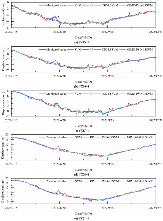 Following the determination of the unified factor set, the trained MIMO-PSO-LSSVM model can be utilized to achieve the synchronous prediction of the displacement of the same dam block. In this paper, three prediction models, SVM, BPNN, and PSO-LSSVM, are selected as comparison models for the MIMO-PSO-LSSVM model. The computational parameters of the BPNN model are set as follows: the maximum number of training iterations is set to 1000, the learning rate is 0.1, and a default sigmoid function is employed between the input and hidden layers. The computational parameters of the SVM model are set as follows: the radial basis kernel function g takes the value of 0.8, and the penalty factor c takes the value of 4.0. The computational parameters of the PSO-LSSVM model are set as follows: the SVM adopts the least squares learning algorithm and uses the radial basis kernel function, the PSO optimization algorithm is chosen to determine the penalty parameters and the radial basis kernel function parameters, the initial population size of the PSO algorithm is set to 20, the maximum number of iterations is 300, the inertia factor ω is set to 0.8, and the learning factors c1 and c2 are set to 2. The computational parameters of the MIMO-PSO-LSSVM model are set as follows: the penalty parameter, the regularisation parameter, and the radial basis kernel function parameter take values ranging from 0.01 to 15, and the PSO optimization algorithm is chosen to determine these parameters; the initial population size of the PSO algorithm is taken to be 20, the maximum number of iterations is 300, the inertia factor ω takes the value of 0.8, and the learning factors c1 and c2 take the value of 2.