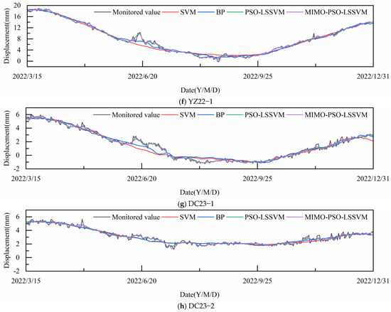 As illustrated in Figure 14, the performance of the four prediction models, SVM, BPNN, PSO-LSSVM, and MIMO-PSO-LSSVM, is evaluated through eight measurement points. These eight measurement points comprise the non-overflow dam block measurement points YZ15-1, YZ16-1, and YZ17-1, the overflow dam block measurement points YZ20-1, YZ21-1, and YZ22-1, and the different elevation measurement points DC23-1 and DC23-2. It can be observed that all the models capture the main trends of the displacement changes of the dam block, with the MIMO-PSO-LSSVM model predicting the closest to the true value of the displacement, while the PSO-LSSVM model is the next closest, and the BPNN and SVM models predicting the worst.
