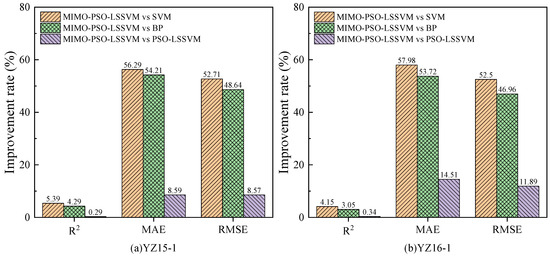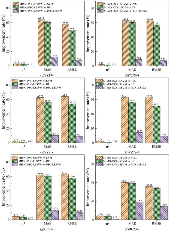 The comparison of the comprehensive performance evaluation metrics under different prediction models is shown in Table 5. Each model is benchmarked against the proposed MIMO-PSO-LSSVM model. The analysis is conducted based on the average data obtained from eight measurement points. Compared with the SVM model, the MIMO-PSO-LSSVM model achieves an improvement of 3.56%, 60.18%, and 58.92%, in terms of R2, MAE, and RMSE, respectively. Compared with the BPNN model, the MIMO-PSO-LSSVM model achieves an improvement of 2.54%, 56.13%, and 51.22%, in terms of R2, MAE, and RMSE, respectively. Compared with the PSO-LSSVM model, the MIMO-PSO- LSSVM model achieves an improvement of 0.27%, 12.72%, and 9.74%, in terms of R2, MAE, and RMSE, respectively. The enhancement effect is illustrated in Figure 15. This result demonstrates that when predicting multiple datasets with high correlation, the prediction accuracy of the traditional single-output model is inferior to that of the proposed MIMO-PSO-LSSVM model. This is due to the fact that the MIMO-PSO-LSSVM model takes into account the potential spatial correlation between the displacement data, thus enhancing the prediction accuracy.