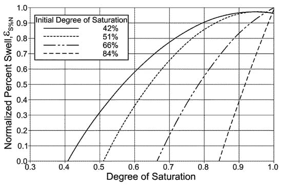 Relationship of normalized swelling percentage and degree of saturation, reproduced with permission from Chao, K.C., Design Principles for Foundations on Expansive Soils; Ph.D. Dissertation, Colorado State University, 2007 [].