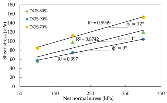 Variation in shear strength with the net normal stress under different DOS.