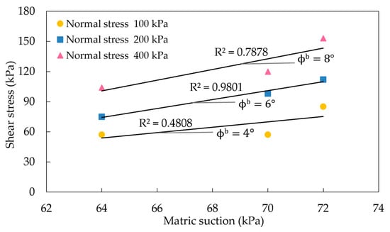 Figure 4 shows the relationship between shear stress and net normal stress. As shown in Figure 4, the friction angle (ϕ’) was determined to range from 9° to 12°, indicating no significant variation in friction angles across different initial degrees of saturation, while cohesion varies with matric suction. The coefficient of determination (R2) for the fitted lines was calculated to assess the reliability of the trend. The R2 values shown in Figure 4 range from 0.874 to 0.997, indicating a strong correlation between the measured data and the regression lines. Figure 5 presents the shear stress vs. matric suction for the samples tested. The interface friction angle (ϕb) determined for the samples tested ranges from 4° to 8°, indicating that the interface friction angle (ϕb) increases as the normal stress increases. The R2 values shown in Figure 5 range from 0.481 to 0.980. The R2 value for the 100 kPa case was relatively low, suggesting a weaker correlation under low confining pressure. However, the determined ϕb value is approximately two-thirds of the ϕb value, which is consistent with general findings provided in Fredlund et al. (2012) [].