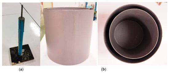 A series of laboratory tests were conducted to analyze soil–pile interaction and determine the uplift coefficient under varying saturation levels. Soil samples were prepared at 60%, 70%, 80%, and 90% saturation based on the compaction curve for the direct shear tests. A cement mortar pile model (1:2:0.45 mix, reinforced with RB6) was used, measuring 2.17 cm in diameter and 26 cm in length (refer to Figure 6a).