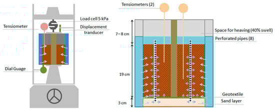 The schematic view of the pile uplift model test is presented in Figure 7. During the testing, the unsaturated soil was gradually wetted via external water infiltration through the center of the container. Tensiometers (Model 2100F) at various depths recorded changes in matric suction. Water infiltration caused soil swelling, generating uplift forces along the pile shaft. Uplift displacement was measured using a transducer, with the load frame’s adjustable screw maintaining the pile’s position. The uplift forces were recorded using a 2 kN load cell at 10 min intervals until stabilization or the estimated maximum was reached. This procedure was repeated for different initial saturation levels, with matric suction measured throughout the test.