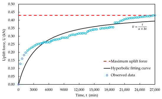 The uplift force vs. time was measured throughout the pile uplift tests. The change in uplift force with time was analyzed by fitting the observed data to a hyperbolic model, as described by Equation (13).