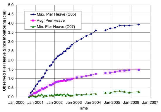 Pile heave pattern at the TRACON site, Denver, Colorado, USA, reproduced with permission from Chao, K.C., Design Principles for Foundations on Expansive Soils; Ph.D. Dissertation, Colorado State University, 2007 [].