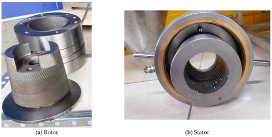 Colloid mills utilize a high-speed rotor–stator mechanism to generate intense shear forces in a narrow gap, fragmenting raw material into fine particles. During milling, the rapidly rotating rotor and stationary stator act together to create a high shear field, enabling significant particle size reduction []. However, conventional rotor–stator designs often lack the ability to achieve uniform, ultra-fine grinding of tougher materials such as bone, and may leave unacceptable coarse fragments in the final paste. Addressing these limitations through improved tool geometry is essential for producing homogeneous meat–bone emulsions and enhancing the overall efficiency of meat by-product processing.