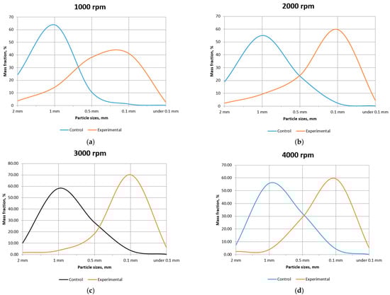 In contrast, the experimental rotor–stator configuration demonstrated a significantly greater capability for fine grinding. At 1000 rpm, only 3.67% of bone fragments had a size of 2 mm (compared to 24.32% in the control configuration). Increasing the rotor speed to 3000 rpm further shifted the particle size distribution toward finer fractions: only 1.67% of the fragments remained at 2 mm, while 70.30% were in the 0.1 mm fraction, and 6.24% belonged to the sub-0.1 mm category. At 4000 rpm, the proportion of the finest fraction slightly decreased (to 5.21% for particles smaller than 0.1 mm), but the share of coarse particles (≥1 mm) remained minimal.