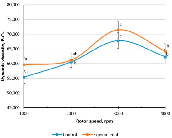 Changes in dynamic viscosity of meat–bone paste depending on rotor speed (different letters (a–c) above lines indicate significant differences between rotor speeds, p < 0.05).