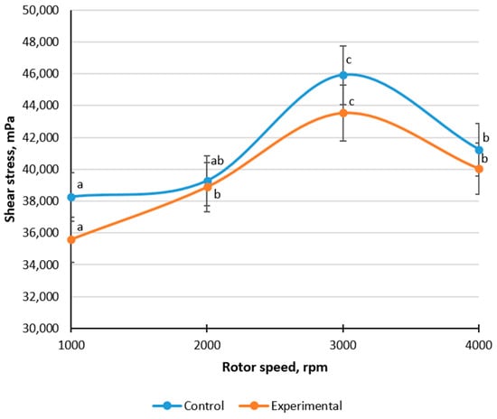 Changes in shear stress of meat–bone paste depending on rotor speed (different letters (a–c) above lines indicate significant differences between rotor speeds, p < 0.05).