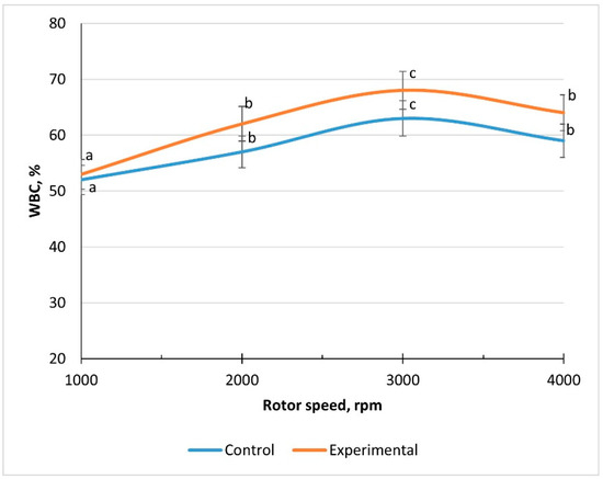 Changes in WBC of meat–bone paste depending on rotor speed (different letters (a–c) above lines indicate significant differences between rotor speeds, p < 0.05).