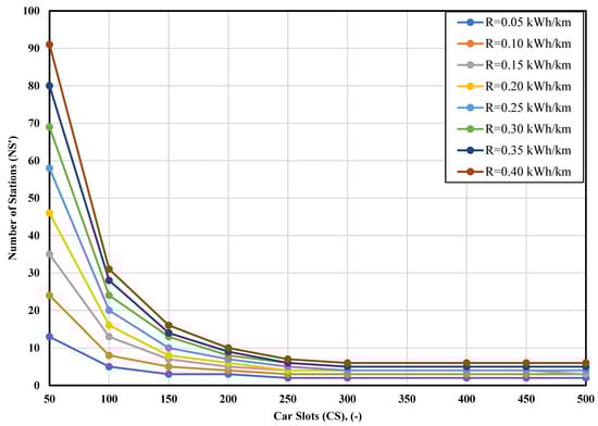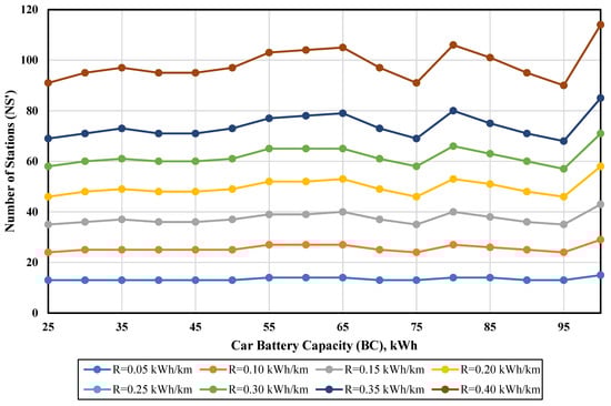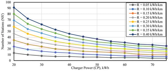 - Lowest R = 0.05 kWh/km: At this optimal efficiency level, the NS’ required started at 13 for the lowest CP of 20 kWh. As CP increases, a notable decrease in station requirements is observed. For instance, at CP values of 40 and 45 kWh, the NS’ drops to seven and six, respectively. The highest CP of 75 kWh requires the fewest stations, with only four needed.