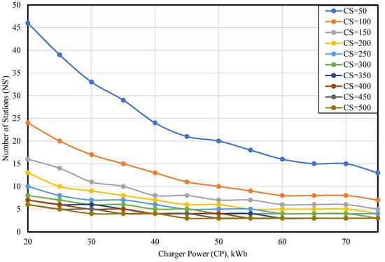 - Mid-range CSs (200 to 250 Cars): A marked reduction in the NS’ is observed when the CSs are increased to 200 and 250. For CP values of 20 and 75 kWh, the station requirements decrease to 13 and 4 for CSs = 200 and further down to 10 and 4 for CSs = 250, respectively.