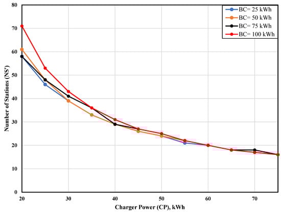 - Increasing the charger power leads to an apparent decrease in the number of stations, while the effect of the battery capacity on the NS’ required is limited, especially for values of charger power more significant than 30 kWh.