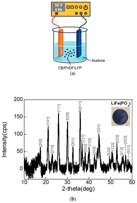 Figure 1a shows the surface of the EPD-deposited LFP film, which appears dense and uniform, further supporting the effectiveness of the AC-EPD method in forming a high-quality electrode layer. Overall, the XRD analysis in