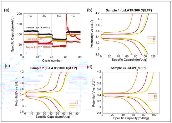 Figure 2b–d. These results clearly highlight the effect of the electrolyte interface and LATP sintering temperature on the electrochemical behavior of the LFP electrodes under various current rates. Sample 1, using LATP sintered at 900 °C, demonstrates the best rate performance and stability among the three configurations. As shown in