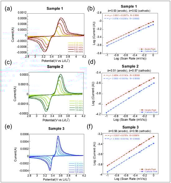 Figure 3a,b. These values are very close to 0.5, indicating that the redox process is predominantly diffusion-controlled. The near-symmetric CV curves and stable peak separation further suggest efficient Li