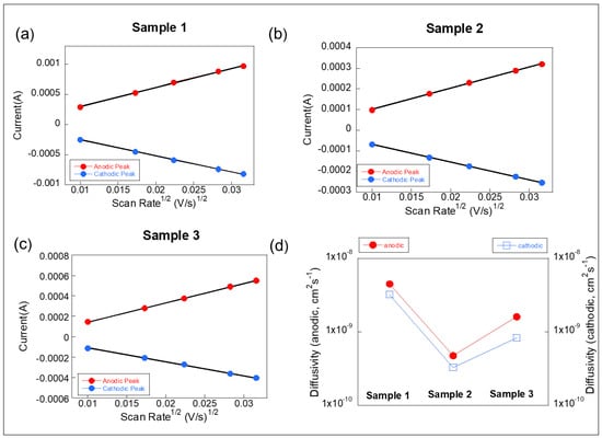 Figure 4a–c) was used to extract diffusion coefficients based on the Randles–Sevcik equation. The resulting diffusivity values are summarized in the bar graph shown in