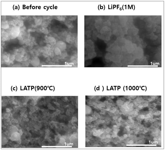 Figure 5d for LFP cycled with LATP sintered at 1000 °C may be attributed to mechanical stress accumulation at the rigid LATP interface, leading to particle compaction. Additionally, potential interfacial reactions—such as elemental diffusion from LATP (e.g., Ti or P)—could chemically modify the LFP surface, suppressing the original granular texture. These mechanisms, though not directly confirmed here, are consistent with the reported degradation pathways in high-temperature-processed solid-state interfaces and warrant further investigation using post-mortem structural and compositional analyses.