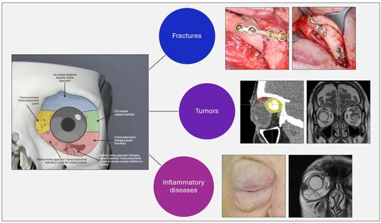 Graphic representation of surgical accesses and major pathologies of the orbit: fractures and bone defects, neoplastic neoformations, and inflammatory pathologies.
