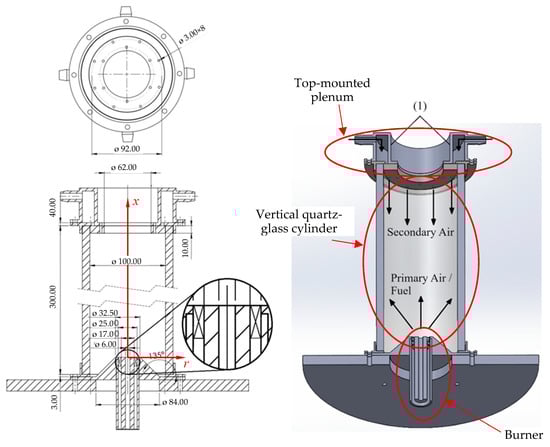 The combustion chamber investigated in the present work is shown in Figure 1. It is a vertical quartz-glass cylinder wrapped in a thick glass–fiber blanket to provide insulation. The inner diameter and the length of the chamber are equal to 100 mm and 300 mm, respectively. The thickness of the wall of the cylinder is 10 mm, and the insulation is 30 mm thick. The burner features a central tube, coaxial with the cylindrical chamber, surrounded by an annular swirler with vanes inclined at 45° to the axial direction. The burner head is elevated, positioned inside the chamber at a height of 25.8 mm above the base, resting atop a truncated cone.