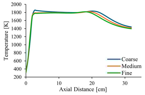 Figure 2 shows the temperature profiles along the centreline of the combustor and along a radial profile at the exit, in the middle axial plane of the computational domain, for pure natural gas, λ = 1.7 and α = 50%. The estimated order of convergence was found to be p = 1.77 and p = 1.84 for two points along the centreline, at distances of 210 and 345 mm from the burner exit, respectively. These values are a little lower than the theoretical value of p = 2, which is expected for a second-order spatial discretization scheme. This deviation is not surprising, as the actual order of convergence is influenced by factors such as grid quality and the non-linearities of the governing equations.