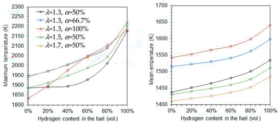 Maximum (left side) and mean (right) temperatures as a function of the hydrogen content in the fuel.