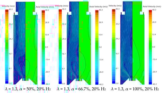 The contraction of the horizontal cross-section, caused by the top mounted plenum, results in a peak temperature in the centreline at x ≈ 25 cm, as previously observed in Figure 5, particularly for α = 50%. These characteristics of the temperature field are also observed for the pure hydrogen flame, even though the temperatures are higher in this case. The inlet fuel and air velocities are also higher for hydrogen flames because the decrease in density, as the hydrogen content in the fuel increases, outweighs the reduction in mass flow rate. The higher velocities contribute to a reduction in the size of the central recirculation zone (see Figure 6) and a downstream shift in the initial temperature rise, despite the greater reactivity of hydrogen compared to natural gas.