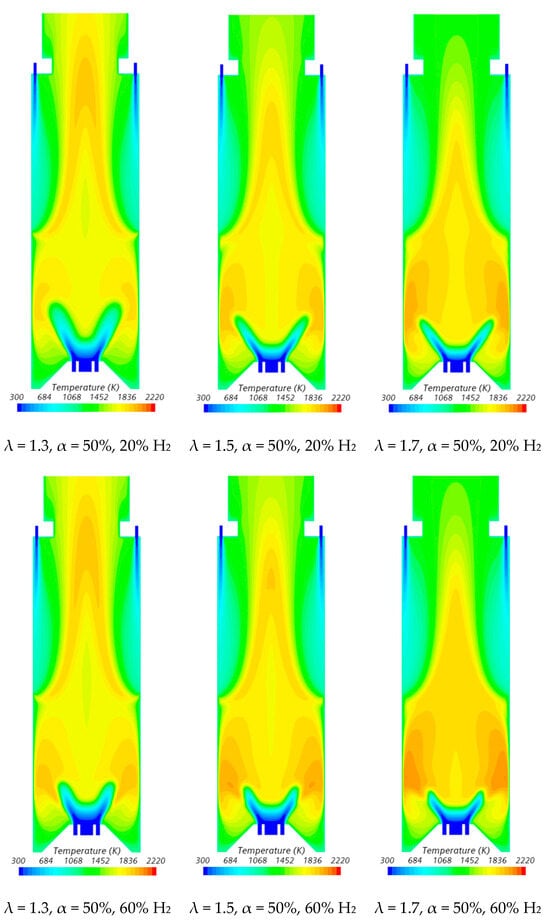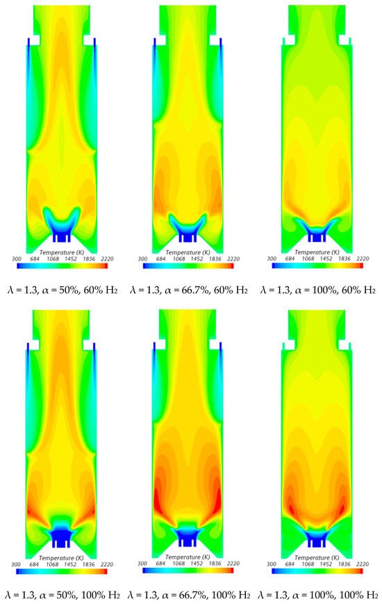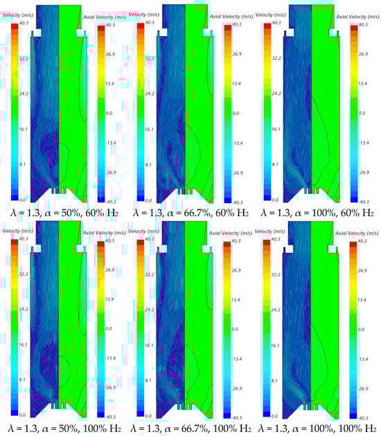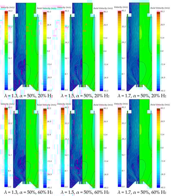 The influence of the excess air coefficient on the velocity field and temperature contours in an axial plane passing through the centre of a secondary air injection hole is illustrated in Figure 9 and Figure 10, respectively, for α = 50%. The velocity field remains nearly unchanged with varying λ for a given fuel composition. However, a slight increase in the size of the central recirculation zone is observed as λ increases. This occurs due to the enhanced swirl intensity with additional air, which strengthens mixing and recirculation. An increase in the excess air coefficient leads to higher temperatures in the region between the inner and outer shear layers of the swirling flow. This is because, for α = 50%, combustion near the burner occurs under fuel-rich conditions, and the local equivalence ratio, based only on the primary air and fuel, approaches unity as λ increases from 1.3 to 1.7, raising the adiabatic flame temperature. In addition, as λ increases, the amount of unburned fuel leaving the reaction zone near the burner decreases. Consequently, the reaction with secondary air occurring further downstream takes place under leaner conditions, leading to lower temperatures towards the exit section.