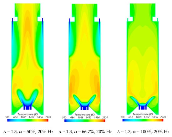 NO emissions increase with the excess air coefficient for a given fuel composition, particularly at high hydrogen content. In fact, for α = 50%, the adiabatic flame temperature in the reaction zone near the burner, based on the local equivalence ratio, rises as λ increases from 1.3 to 1.7, as previously discussed. The higher temperatures, which can be observed in Figure 10, enhance thermal NO formation, resulting in increased NO emissions.
