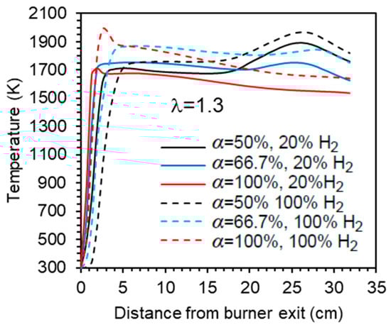 The influence of the primary air fraction on the temperature profile along the centreline is further illustrated in Figure 8 for λ = 1.3. In the case of α = 66.7%, the mixture remains fuel-rich in the reaction zone near the burner, but the temperature profiles are smoother compared to α = 50%. Higher temperatures are reached in the central recirculation zone, while the peak temperature at x ≈ 25 cm is significantly reduced. When α = 100%, a single peak temperature occurs near the burner, followed by a gradual decrease further downstream towards the exit section.
