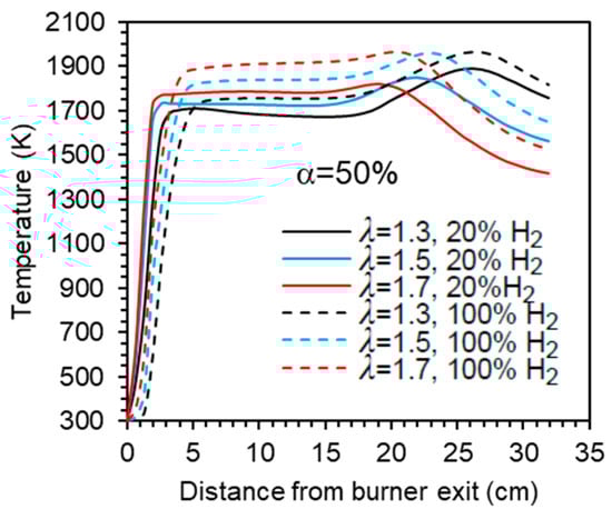 The axial profiles displayed in Figure 5 show a sharp temperature increase near the burner exit. Further downstream, the temperature remains nearly constant up to x ≈ 20 cm before rising again to reach a peak in case α = 50%, after which it decreases towards the exit section of the combustor. That peak is attenuated for α = 66.7% and does not occur for α = 100%, i.e., when there is no secondary air. In the latter case, the peak temperature occurs close to the burner. The higher temperatures observed for hydrogen flames in comparison to blended mixtures of hydrogen and natural gas have also been observed in many previous studies, e.g., [,,,]. This is due to the increase of the adiabatic flame temperature when the hydrogen content in the fuel rises. However, this increase is relatively small for low hydrogen content and only becomes larger when it approaches 100%, which explains the differences in the temperature profiles between the NG/H2 blends and the hydrogen flame.
