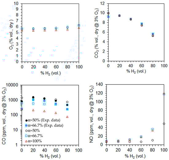 - The O2 and CO emissions are higher for α = 50% and 66.6% than for α = 100%, indicating incomplete combustion in the former case. The NO emissions are lowest for α = 50% and show little variation between α = 66.7% and α = 100%. They do not exceed 50 ppm, except for pure hydrogen combustion and α ≥ 66.7%. For a given fuel composition, CO2 and CO emissions decrease, while NO emissions increase with the excess air coefficient.