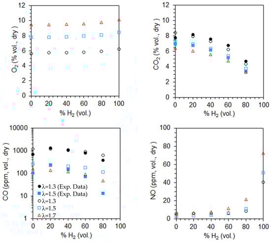 Molar fractions of the species at the exit for α = 50% as a function of the excess air coefficient and hydrogen content in the fuel (open symbols—predictions, solid symbols—measurements).