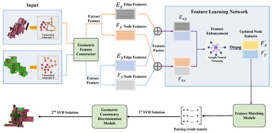 The proposed graph structure registration framework, as shown in Figure 1, consists of four core modules: the Feature Construction Module (FCM), the Feature Learning Network Module (FLM), the Node Feature Matching Module (NFM), and the Geometric Consistency Discrimination Module (GCDM). The specific workflow is shown as follows: