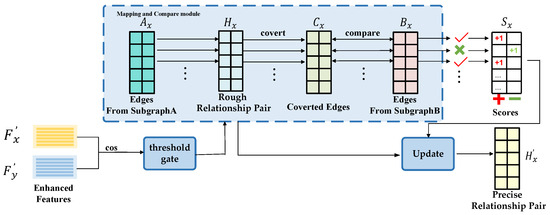 - Threshold Setting: The module begins by computing the cosine similarity matrix from the enhanced node features of the corresponding points in the two images. A threshold filter is then applied, which considers pairs with a cosine similarity below 0.8 as non-matching and excludes them. The pairs with the highest cosine values are selected to form a preliminary coarse correspondence matrix .