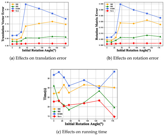 Effects of initial rotation angle on rotation error, translation error, and running time.