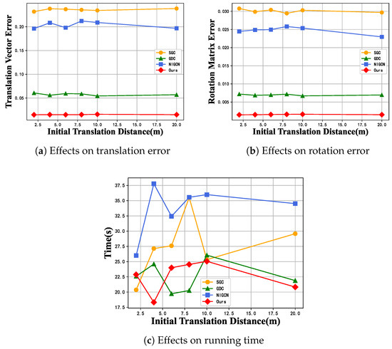 In this experiment, the initial rotation angles were fixed at [−90°,90°], and the initial translation distances were systematically varied from to to explore the relationship between registration results and initial translation distances. The experimental results are shown in Figure 6.