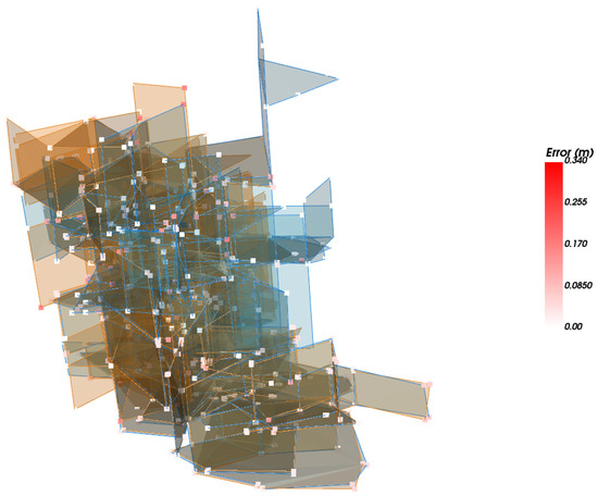 The analysis reveals that all algorithms demonstrate a lack of sensitivity to variations in initial translation distances. For rotation errors, the results of SGC, NIGCN, GDC, and our method are basically unaffected by changes in initial translation distance, maintaining a consistent level of rotation error. This observation suggests that these algorithms exhibit commendable stability across different initial translation distances. In contrast, our method showcases enhanced robustness and more consistent outcomes when addressing varying initial rotation angles and translation distances. Furthermore, our approach reaches a stable state without the need for iterative processes, thereby exhibiting greater efficiency. Specifically, our method achieves a standard deviation of translation vector error of , which is nearly an order of magnitude lower than the standard deviation of observed in the suboptimal method, indicating a significantly higher level of stability. Figure 7 shows the registration results of two images with an initial translation error of 10 m. The color value of the vertex represents the normalized value of the distance error. The redder the color, the larger the relative error, and the lighter the color, the smaller the error.