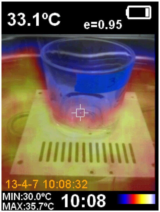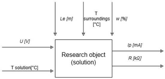 For the purpose of carrying out the tasks related to the main objective of the work, an experiment was planned. For this purpose, 50 mL of each solution was taken. A control sample with tap water was also determined. The samples were placed in glass beakers. To avoid contaminating and disturbing the composition of the sample being tested, a separate container of water was used in which the beakers were immersed. The water was heated to the appropriate temperatures. The parameters of the solutions were controlled with a thermal imaging thermometer, and a specially prepared heater maintained the set water temperature. After determining the appropriate liquid temperature, a waiting period of 2 min was observed before the sample was tested. The DC resistance was calculated using the formula: