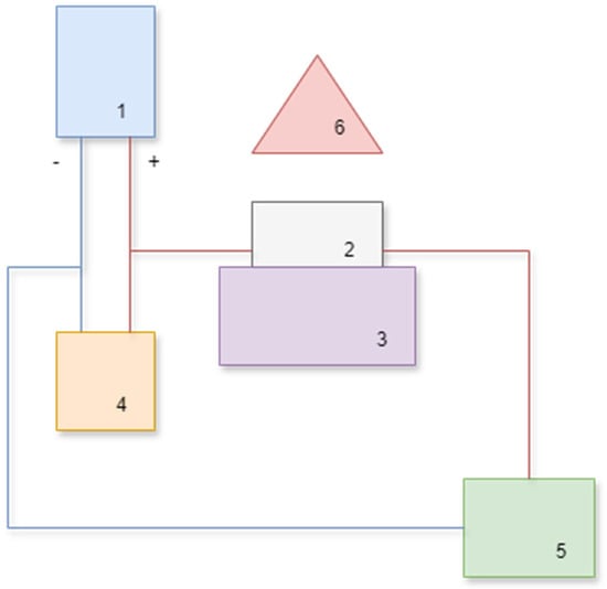 Block diagram of the test bed: 1—laboratory power supply unit, 2—beaker with tested solution, 3—water bath, 4—voltmeter, 5—ampere meter, 6—thermal imaging camera.
