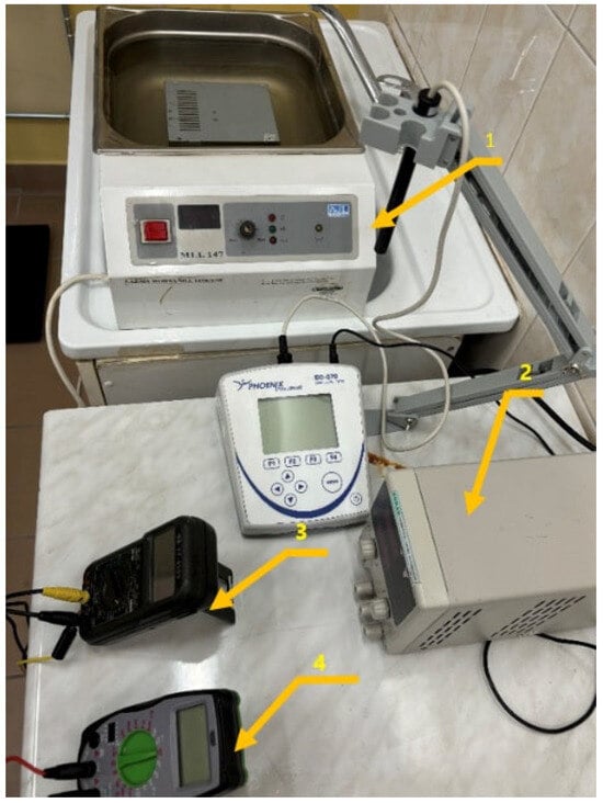 View of the test stand: 1—water bath, 2—laboratory power supply unit, 3—ampere meter, 4—voltmeter.