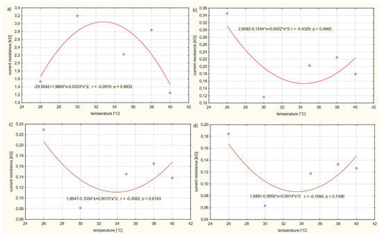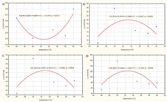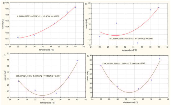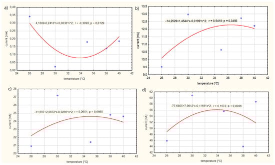 The regression analysis showed a correlation between the temperature T of the solution and the current consumption Ip by the electrolyte. This relationship is described by the quadratic function shown in Figure 6. It was found that, for case (a), an increase in the temperature T of the solution results in an electrolyte current density Ip decreasing in the range of 26–32 °C. However, as the temperature T of the solution increases within the range of 34–40 °C, the current intensity Ip increases. Therefore, there is an extreme minimum at a temperature of approximately 34 °C. It has been observed that, for case (b), in the temperature range T of 26–30 °C for the electrolyte, the current intensity Ip of the electrolyte increases, while, in the range of 36–40 °C, the value of the current intensity Ip of the electrolyte decreases. The extreme maximum for variant (b) was reached at a temperature of 36 °C. However, in cases (c) and (d), it was observed that, with an increase in the temperature T of the solution in the range from 26 to 34 °C, the value of the electrolyte current intensity Ip increases, reaching an extreme for the electrolyte temperature T of about 34 °C, and then the current value Ip decreases. The maximum value of the current intensity Ip of the electrolyte was reached at approximately Ip = 56 mA and the minimum at Ip = 0.06 mA. From the conducted research, it appears that a voltage U on the electrolyte supply above 1 V only causes an increased movement of electrons in the solution. Increased movement of electrons contributes to an increase in the penetration of medicinal products through the skin.