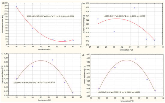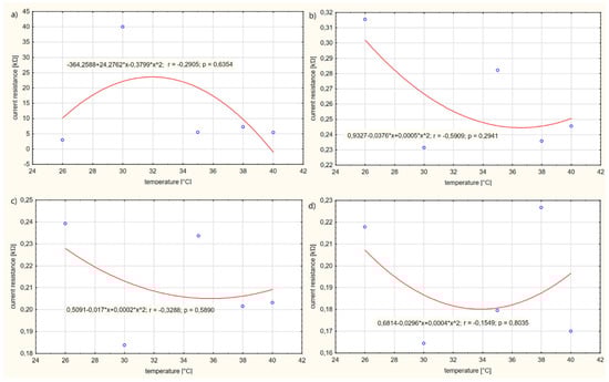 The functional dependencies between the resistance values R of the solutions and the temperature T of the electrolyte are best described by the second-degree curves shown in the diagrams. Certain similarities can be observed for graphs (b), (c) and (d) (Figure 8); the resistance R of the electrolyte in the temperature range T of 26–34 °C decreases, reaching a minimum extreme of about 34 °C, then increases. The course of the graph (a) differs from the other graphs in terms of temperature T of the solution at 26–33 °C; the resistance R of the solution increases, reaching a maximum extreme of about 33 °C T of the solution, then decreases. The maximum value of the electrolyte resistance R is approximately equal to R = 3 kΩ and the minimum R = 0.08 kΩ. From the conducted test, it appears that a voltage U on the electrolyte supply above 1 V only causes an increased movement of electrons in the solution. The increased movement of electrons contributes to an increase in the intensity Ip of the solution, enabling increased permeability of medicinal substances through the skin.